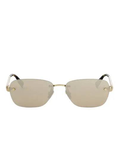 gold rimless tinted lenses textured temples nose pads tortoiseshell tips logo detail These glasses come with a protective case.