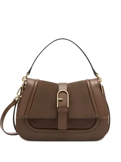 brown gold-tone hardware top handle detachable shoulder strap internal slip pocket buckle fastening
