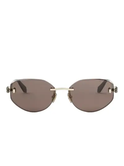gold-tone geometric shape rimless tinted lenses logo detail straight arms nose pads These glasses come with a protective case.