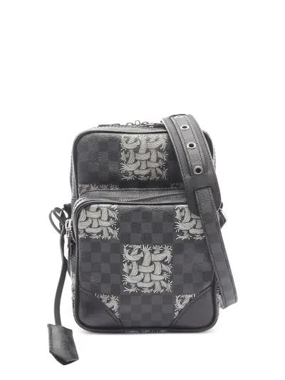 The Amazone features a damier canvas body with leather trim, a flat strap, a top zip closure, an exterior zip pocket, and interior slip pockets. Black. Serial Number: TR3185. Inclusions: charm. Condition: EXCELLENT. This previously owned item is in near-perfect condition with no signs of damage or use. Due to the exclusivity of this item and its limited availability, processing and delivery might take longer than usual. Please refer to the photos on this product page for a detailed view of the item, including any damages declared.