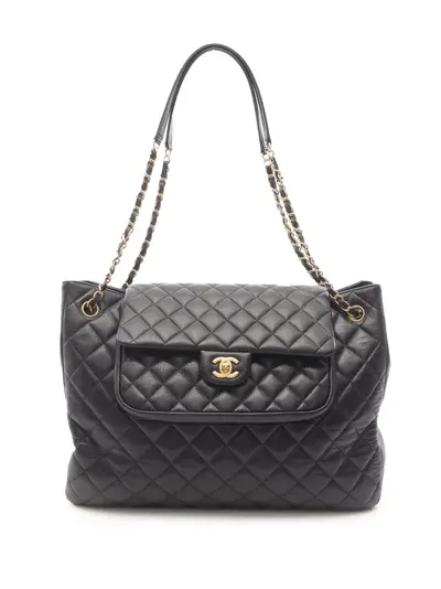 This tote bag features a quilted caviar leather body, leather woven chain link shoulder straps, a top flap with CC turn lock closure, exterior slip pockets, and interior zip and slip pockets. Black. Serial Number: 21397851. This item has no inclusions. Condition: GOOD. This previously owned and used item is in good condition with minimal signs of use. This may include fading of material or plating and scratches. Due to the exclusivity of this item and its limited availability, processing and delivery might take longer than usual. Declared Damages: Exterior Back Feature(s) Moderate Creases. Front Feature(s) Moderate Creases. Please refer to the photos on this product page for a detailed view of the item, including any damages declared.