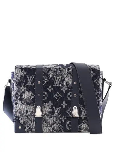 The Monogram Tapestry features a fabric denim body with leather trim, an adjustable flat leather strap, a top flap with snap closure, and an interior slip compartment. Blue. Serial Number: AR4260. This item has no inclusions. Condition: EXCELLENT. This previously owned item is in near-perfect condition with no signs of damage or use. Due to the exclusivity of this item and its limited availability, processing and delivery might take longer than usual. Please refer to the photos on this product page for a detailed view of the item, including any damages declared.