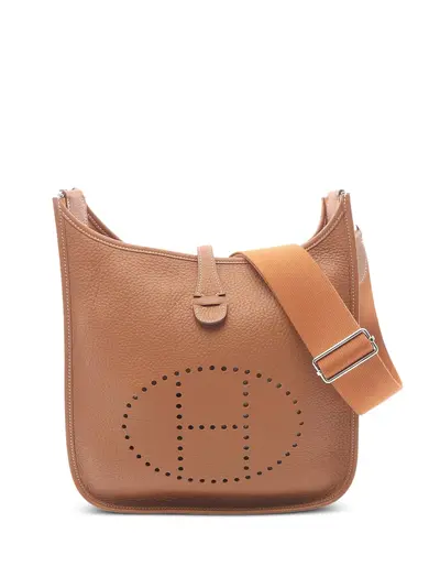 This Evelyne III features a Clemence leather body in Gold color, an adjustable flat canvas strap, an open top with a strap and snap closure, and an exterior back slip pocket. Brown. This item has no inclusions. Condition: EXCELLENT. This previously owned item is in near-perfect condition with no signs of damage or use. Due to the exclusivity of this item and its limited availability, processing and delivery might take longer than usual. Please refer to the photos on this product page for a detailed view of the item, including any damages declared.