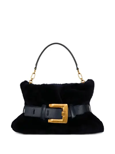 navy blue shearling leather belt gold buckle chain strap detail top handle