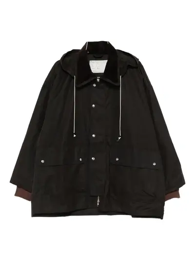 brown corduroy collar front flap pockets drawstring hood front press-stud fastening long sleeves