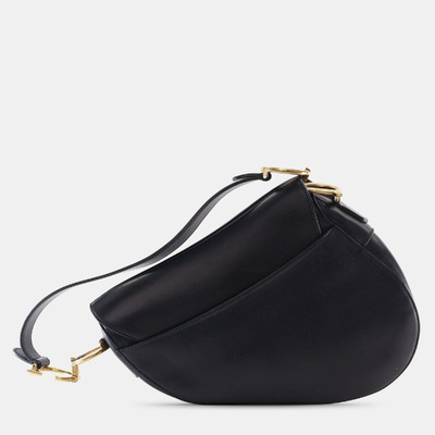 A curved Dior saddle shaped bag in smooth calfskin leather, designed with a magnetic flap and short strap. A modern icon with a distinctive shape, suitable for both shoulder and hand carry.