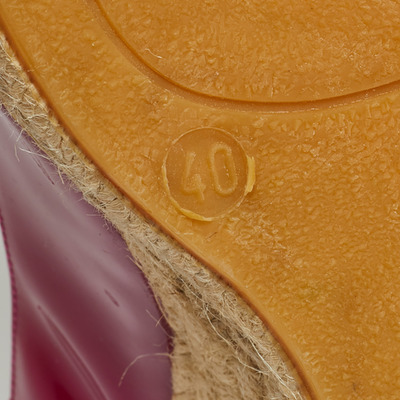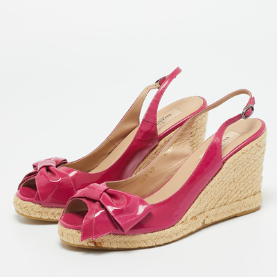 Playful and chic, these Valentino espadrille wedges are crafted in glossy purple patent leather with an elegant bow detail. The slingback silhouette and natural jute heel bring summery sophistication. Ideal for relaxed outings with a touch of glamour.
