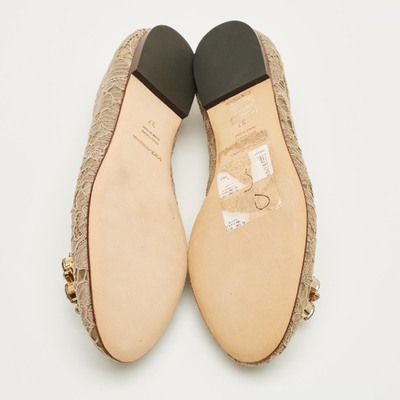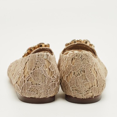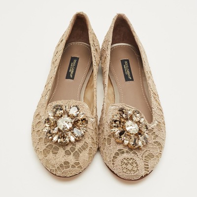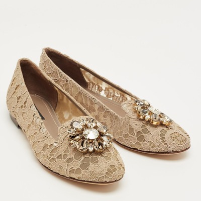A signature of Dolce and Gabbana’s romantic aesthetic, these Taormina flats feature intricate beige lace hand embellished with crystals along the toe. The delicate construction rests on a cushioned leather insole, marrying artisanal craftsmanship with feminine grace—a versatile choice from day events to evening soirées.