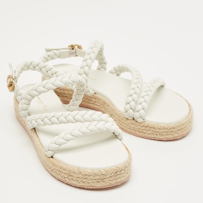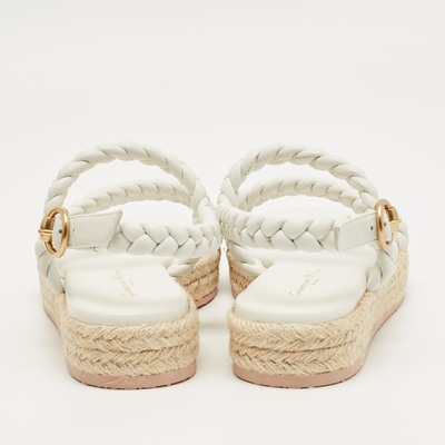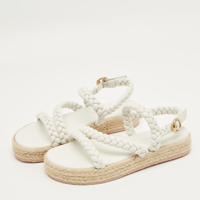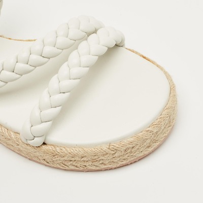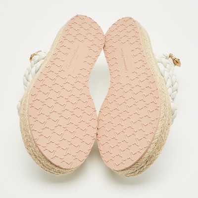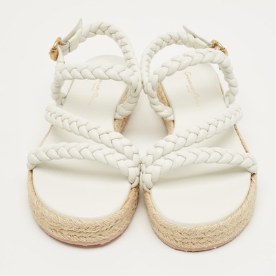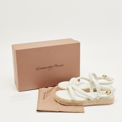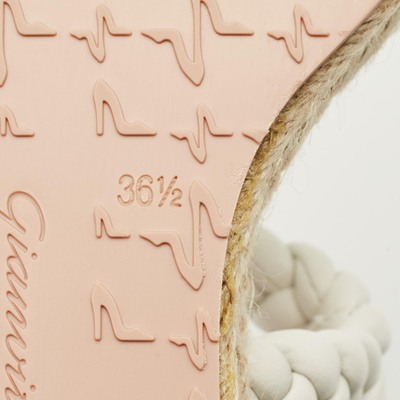 A refined interpretation of summer ease, these Gianvito Rossi espadrilles feature braided white leather straps and a woven jute platform that nods to artisanal tradition. Their balanced design merges height with comfort, while the natural textures evoke a coastal charm—perfect for sunlit outings or resort evenings.