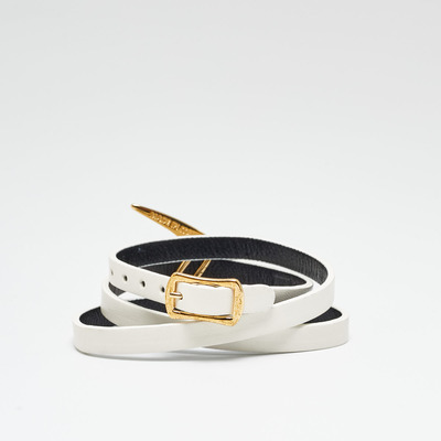 A study in rebellion and refinement, this McQ bt Alexander McQueen bracelet contrasts supple leather with the brilliance of gold tone hardware. The sleek, minimalist form nods to McQueen’s punk inflected design language while retaining a wearable, urban appeal. It’s a versatile piece that brings a subtle edge to crisp tailoring or monochrome ensembles.