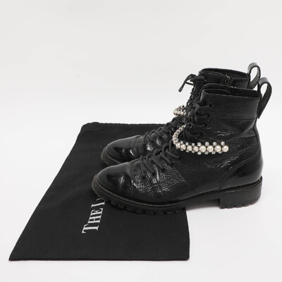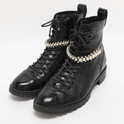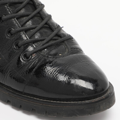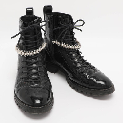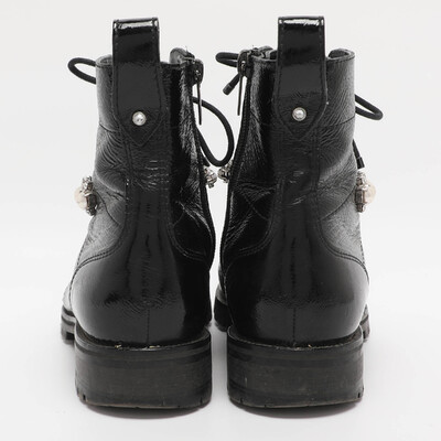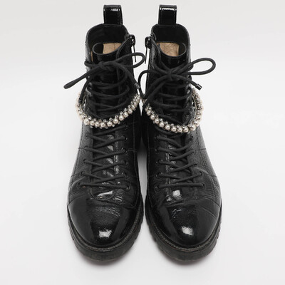 Bold and edgy, these Jimmy Choo Cruz boots are made from glossy black patent leather with lace up detailing. The rugged silhouette is balanced by sleek finishes, and the crystal embellished detailing at the ankle delivers glamour. Perfect for elevating urban streetwear with attitude.