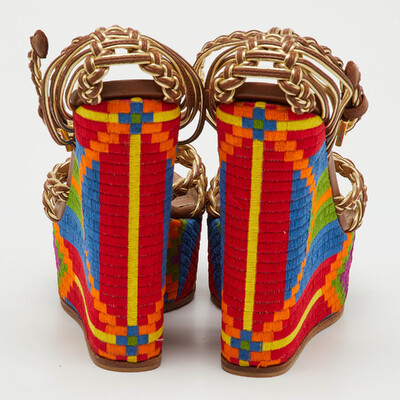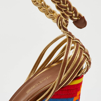 The Roberto Cavalli braided leather wedges bring bold energy to warm weather dressing. The golden straps twist and curve with a sunlit shimmer, balanced by a woven platform in vivid, artisanal colors. They lift not just your height but your mood — perfect for days that call for confidence, color, and a touch of joy.