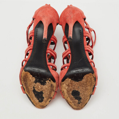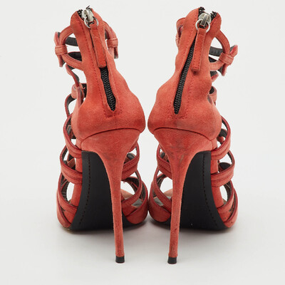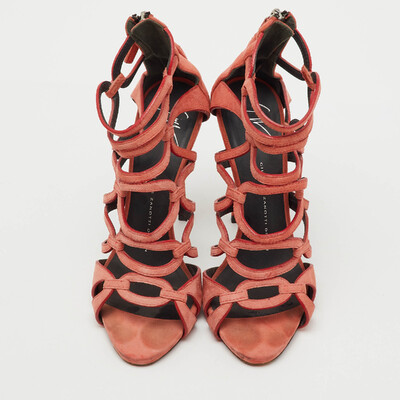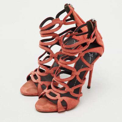 Edgy and feminine, these Giuseppe Zanotti sandals feature a striking cut out caged design in peach orange suede. The ankle strap ensures a secure fit while adding elegance to the bold structure. A statement pair that instantly elevates any outfit.