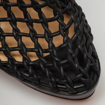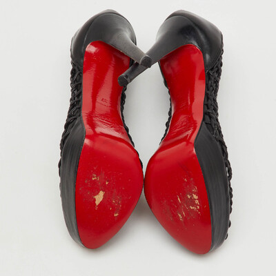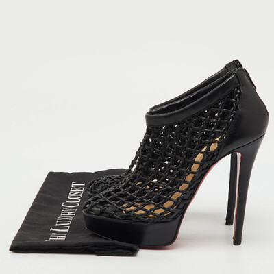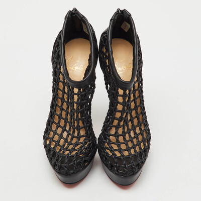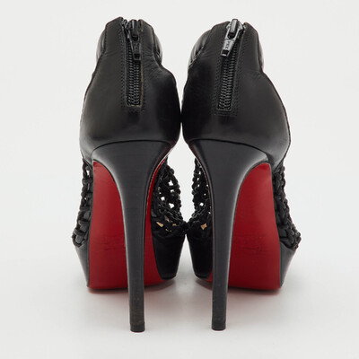 Exuding dramatic elegance, these Christian Louboutin Coussin booties are crafted from black leather with bold platform soles. The sleek silhouette is enhanced by the signature red bottoms for a touch of allure. A powerful pair that redefines statement footwear.