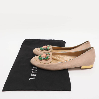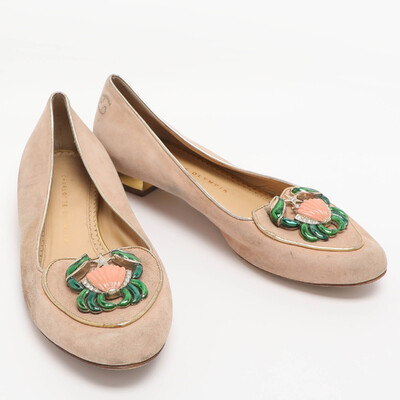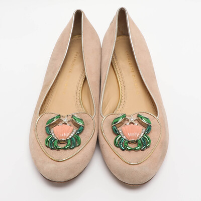 Personal and playful, these Charlotte Olympia ballet flats celebrate the Cancer zodiac with an embroidered motif on soft beige suede. The round toe silhouette and gold tone accents add a hint of charm. A whimsical pair that combines comfort with celestial flair.