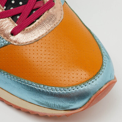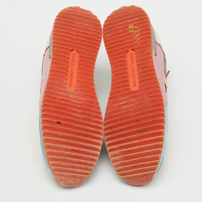 Dolce and Gabbana’s low top sneakers mix vibrant leather panels with sparkling glitter accents, creating a lively, eye catching composition. The cushioned sole and lace up design ensure comfort and a secure fit. They bring energy and personality to every step, turning casual moments into a colorful statement.