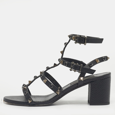 Valentino’s black leather Rockstud sandals feature the label’s signature studded straps and a sturdy block heel. The ankle strap design offers a secure fit, while the subtle shine of the studs adds a hint of luxury. Easy to pair with everything from denim to dresses.