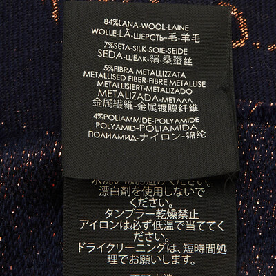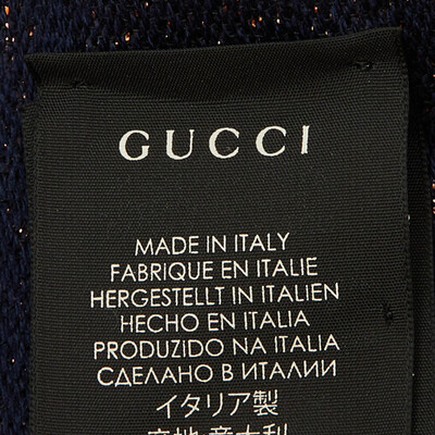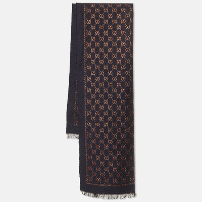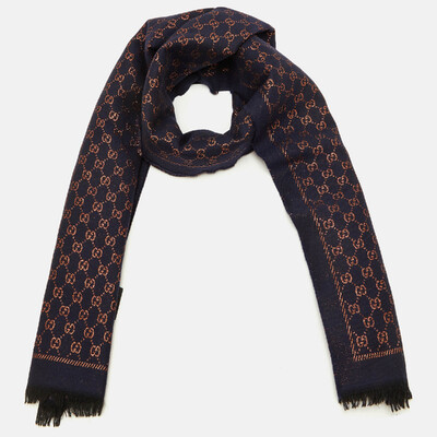 This Gucci scarf combines warmth with refinement, woven in wool with subtle metallic threads that illuminate the tonal GG motif. The navy hue brings quiet depth, while fringed edges add relaxed texture. Wrap it around the neck or drape it loosely for understated winter polish.