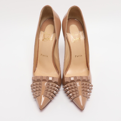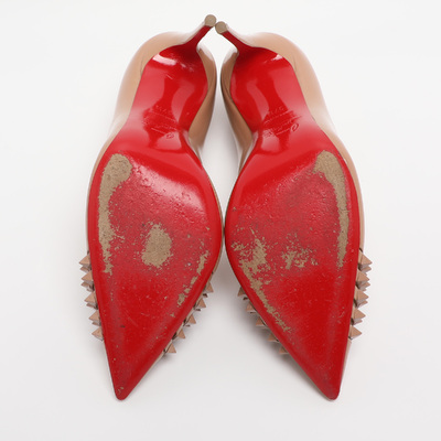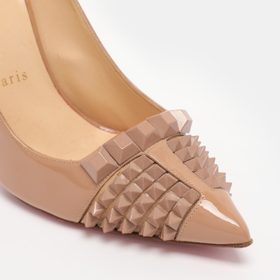 From Christian Louboutin, the Pyrami pumps are crafted in glossy beige patent leather with tonal pyramid stud detailing across the toe. The pointed front and slender stiletto heel create a sharp, modern shape, finished with the signature red sole that keeps the look unmistakably Louboutin.