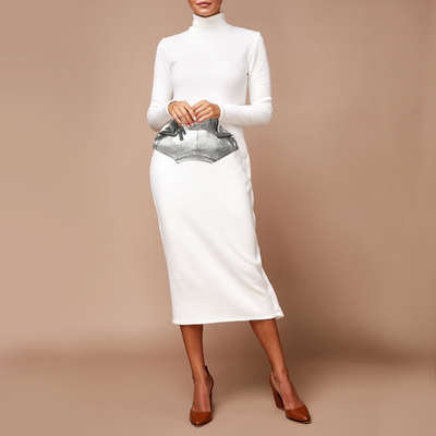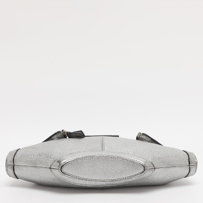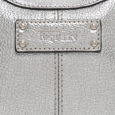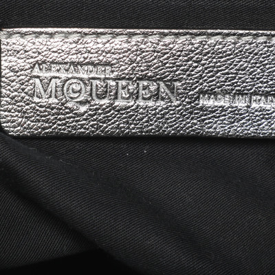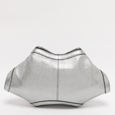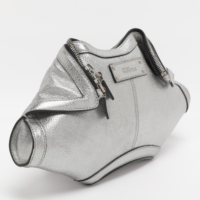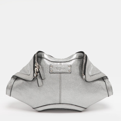 A sculptural play of edge and elegance, this metallic silver clutch captures Alexander McQueen’s fearless artistry. Its folded wings curve with architectural precision, while the mirrored leather surface reflects every flicker of light.
