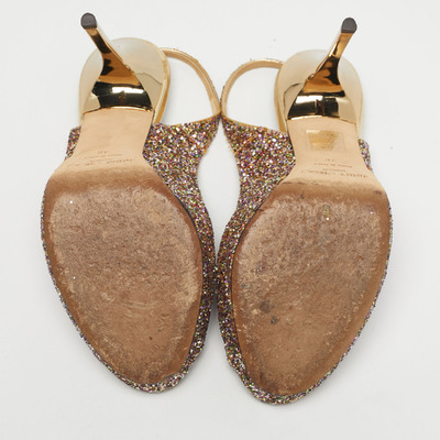 A spread of fine glitter in shifting tones gives these Jimmy Choo pumps their charm. The gold tone heel adds structure beneath the shimmer, while the open toe and slingback keep the mood light, luxurious, and made for nights that refuse to fade.