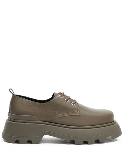 olive green leather round toe front lace-up fastening branded insole low heel ridged rubber sole