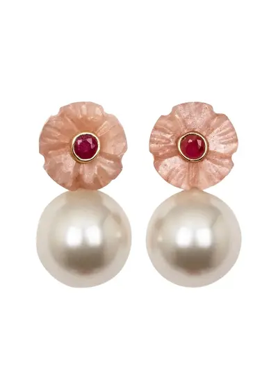 peach and multicolour flower detail stone detail pearl detail drop style for pierced ears Normal everyday use and external agents may reduce the lustre of gemstones and gold surfaces. To maintain, use specific, non-abrasive products specially meant for cleaning jewellery. These earrings come as a pair. Pearls should be the last thing that you put on in the morning and the first thing you take off at night. Avoid contact with perfumes or creams, and simply wipe with a soft cloth to clean.