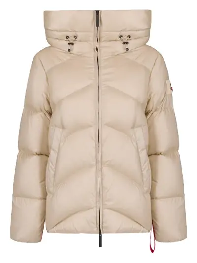 beige padded design quilted finish adjustable hood logo patch front zip fastening side pockets long sleeves