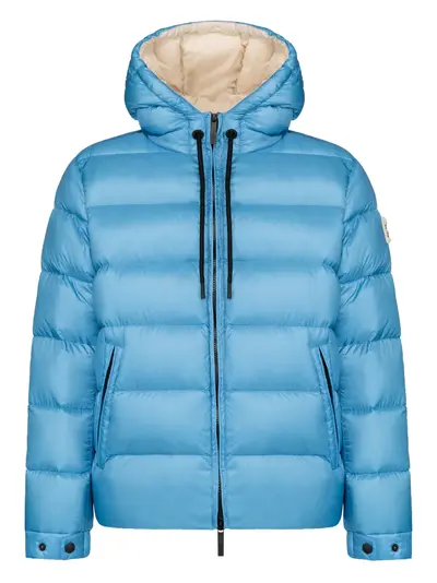 azure blue padded design quilted finish drawstring hood zip fastening side zip pockets long sleeves press-stud cuffs logo patch