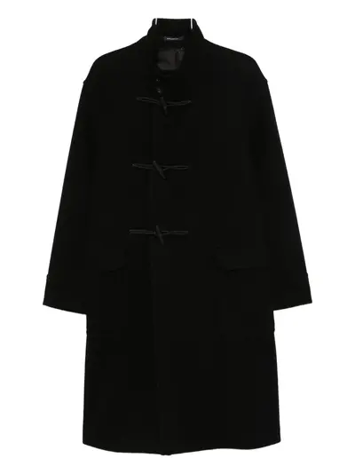 black front toggle fastening two front flap pockets stand-up collar long sleeves