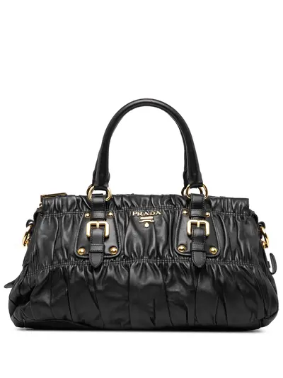 gathered leather body rolled leather handles top zip closure interior zip and slip pockets black This item has no inclusions. Condition: EXCELLENT. This previously owned item is in near-perfect condition with no signs of damage or use. Please refer to the photos on this product page for a detailed view of the item, including any damages declared.