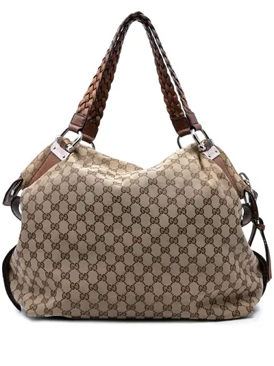 canvas body with leather trim braided leather shoulder straps top zip closure interior zip and slip pockets brown Serial Number: 232927 002123 This item has no inclusions. Condition: GOOD. This previously owned and used item is in good condition with minimal signs of use. This may include fading of material or plating and scratches. Please refer to the photos on this product page for a detailed view of the item, including any damages declared.