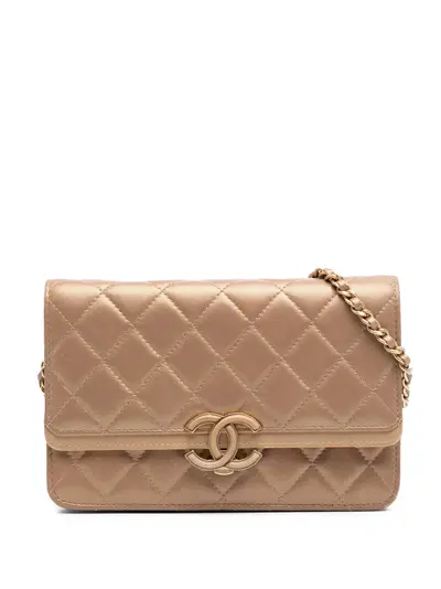 quilted lambskin leather leather-woven chain link strap front flap with magnetic snap closure interior zip and slip pockets brown Serial Number: 28286816 This item has no inclusions. Condition: GOOD. This previously owned and used item is in good condition with minimal signs of use. This may include fading of material or plating and scratches. Please refer to the photos on this product page for a detailed view of the item, including any damages declared.