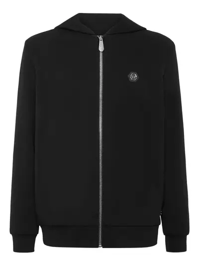 black skull motif crystal embellishment zip fastening hooded logo patch