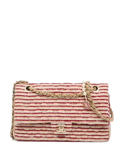 quilted striped jersey body leather woven chain straps with faux pearl accents double front flaps with a CC turn-lock closure exterior back slip pocket interior slip pockets red Serial Number: 19350401 Inclusions: dust bag, charm. Condition: GOOD. This previously owned and used item is in good condition with minimal signs of use. This may include fading of material or plating and scratches. Declared Damages: Embellishment Feature(s) Significant Damages. Please refer to the photos on this product page for a detailed view of the item, including any damages declared.