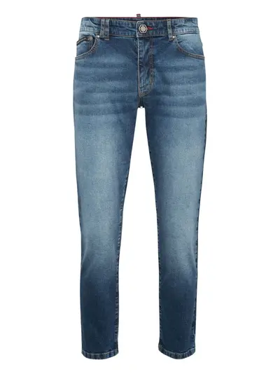 blue embroidered logo patch branded hardware five-pocket styling button fly belt loops