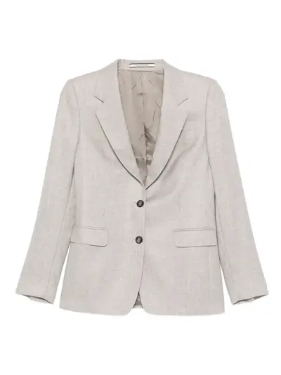 grey notched lapels front button fastening two front patch pockets long sleeves straight hem