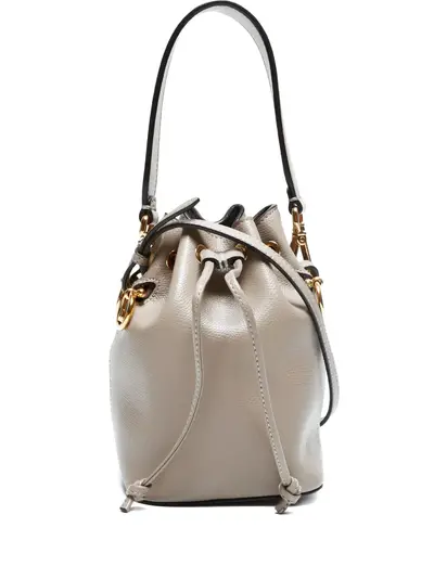 2020-2025s grey drawstring fastening top handle shoulder strap gold-tone hardware bucket style Condition: GOOD. This previously owned and used item is in good condition with minimal signs of use. This may include fading of material or plating and scratches.