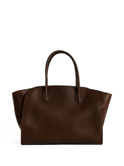 dark brown leather construction top handle curved silhouette stitch detailing double top handles