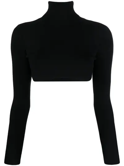 black knitted construction fine knit high neck long sleeves curved hem cropped