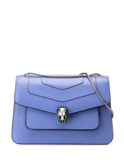 leather body chain link shoulder straps front flap with magnetic snap closure and serpenti adornment interior center zip compartment interior slip pockets purple Inclusions: dust bag, mirror. Condition: GOOD. This previously owned and used item is in good condition with minimal signs of use. This may include fading of material or plating and scratches. Due to the exclusivity of this item and its limited availability, processing and delivery might take longer than usual. Please refer to the photos on this product page for a detailed view of the item, including any damages declared.