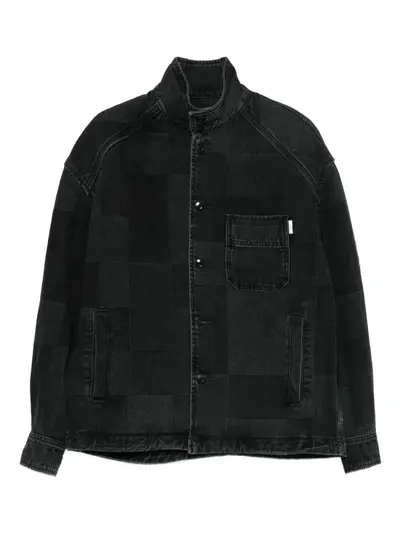 black cotton patchwork design chest patch pocket front button fastening high neck long sleeves