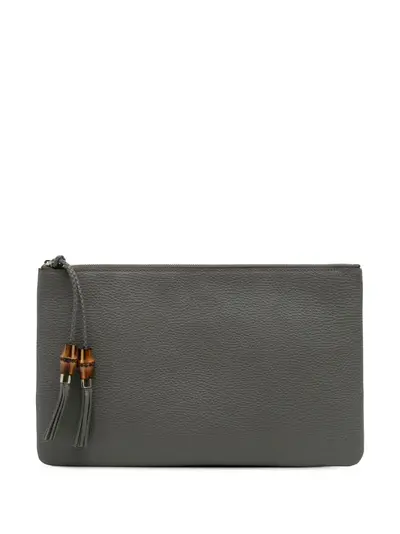 leather body top zip closure with a bamboo tassel zipper pull interior slip pocket gray Serial Number: 449653 203998 This item has no inclusions. Condition: EXCELLENT. This previously owned item is in near-perfect condition with no signs of damage or use. Please refer to the photos on this product page for a detailed view of the item, including any damages declared.