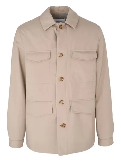 beige button fastening chest pockets front pockets long sleeves buttoned cuffs