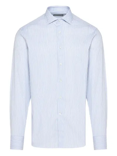 white and light blue striped pattern button fastening long sleeves buttoned cuffs classic collar