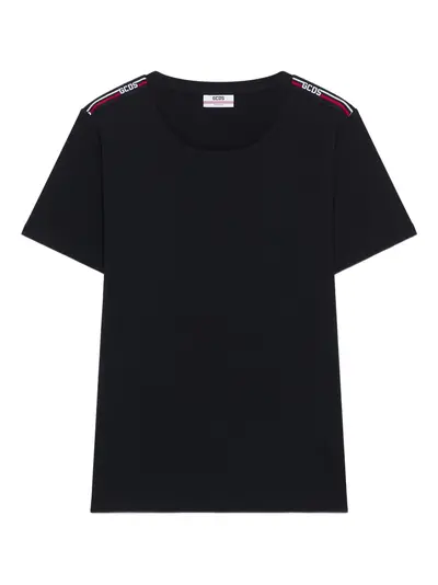 black stretch-cotton shoulder logo detail round neck short sleeves straight hem