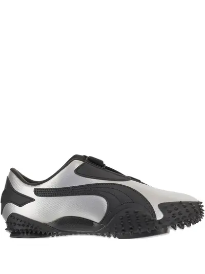 metallic grey elastic hooks front closure logo on the side rubber sole studded sole shape inspired by running shoes