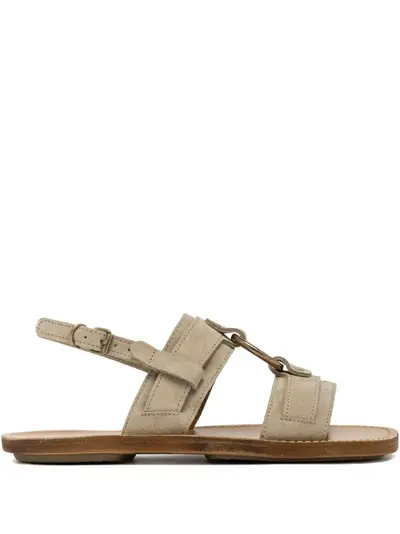 taupe strap buckle fastening ring detail open toe flat sole