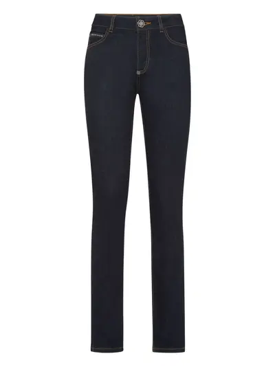 dark blue rhinestone embellishment logo plaque five-pocket styling