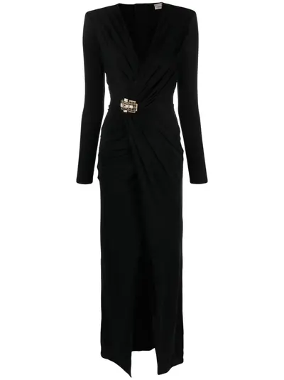 black stretch-design gathered detailing rhinestone embellishment pearl detail V-neck long sleeves rear zip fastening front slit floor-length